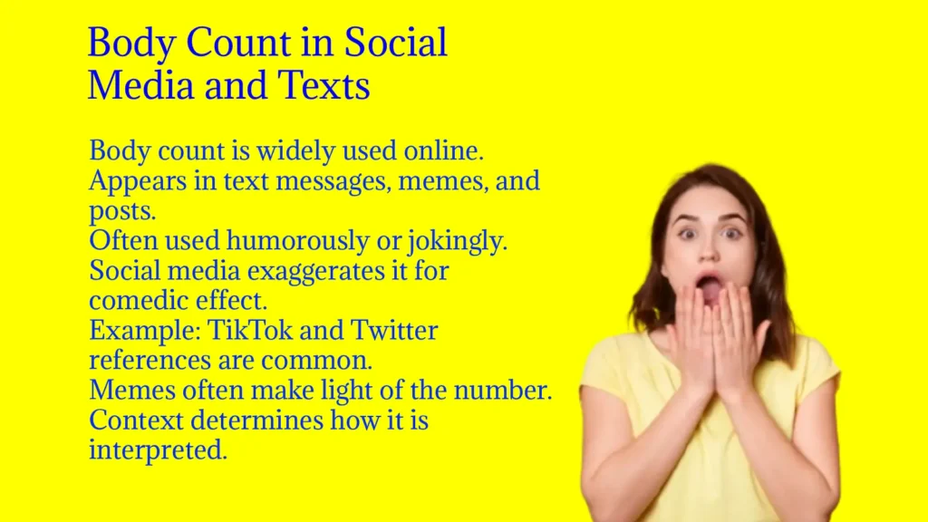 - Tweets, Reddit posts, and TikTok videos often reference body count humorously.