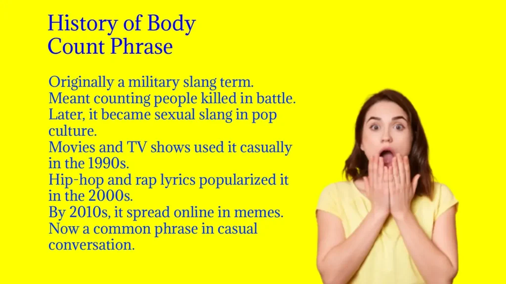 The term body count originally came from military slang, where it referred to the number of people killed in battle. Over time, it evolved in pop culture and internet slang to mean sexual partners.